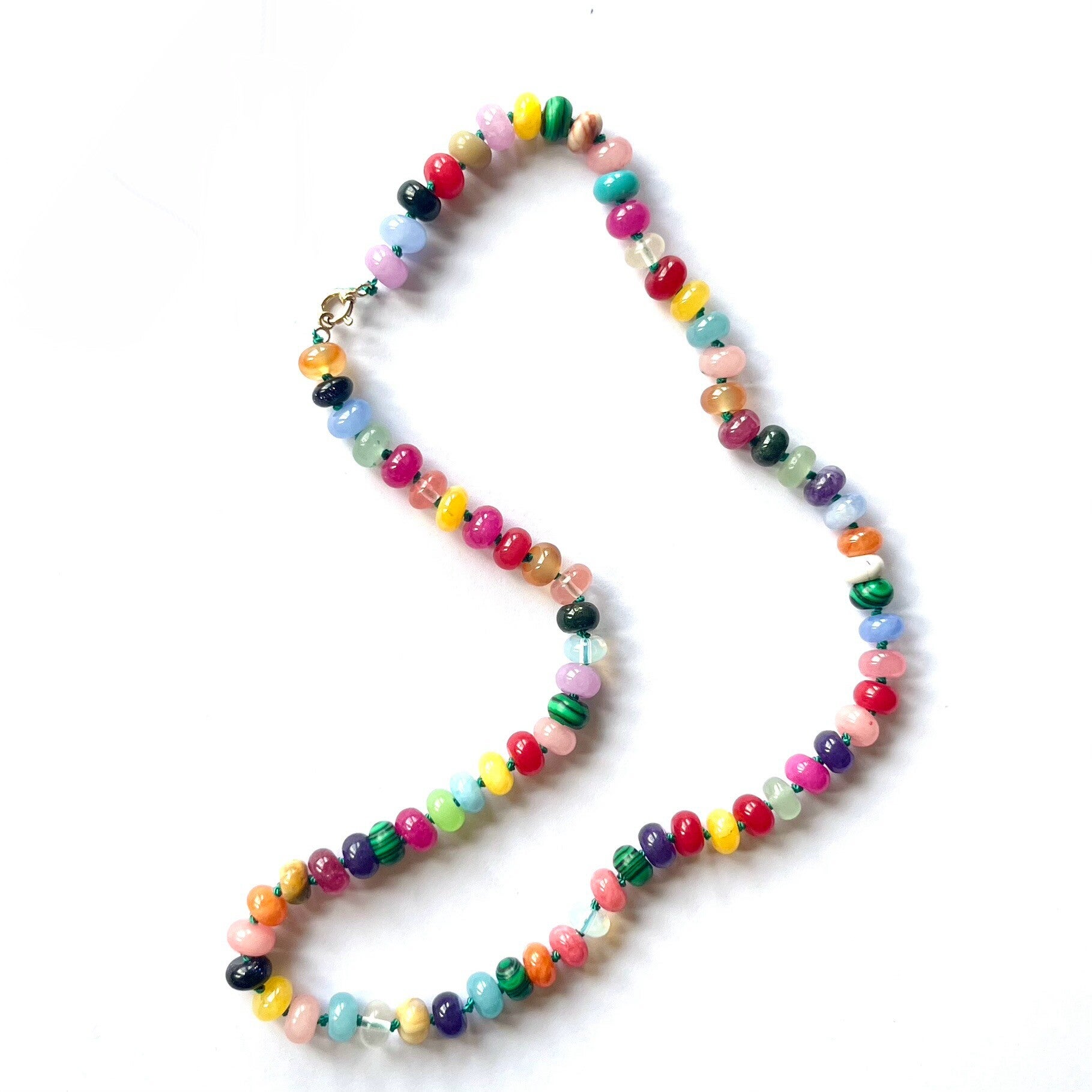 Handgeknoopte ketting gemaakt van een mix van (half) edelstenen. Afgewerkt met een prachtige 14 karaat gouden sluiting.
